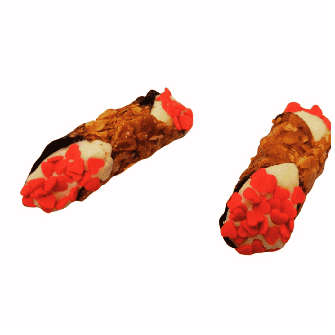 De koekjes zijn volledig glutenvrij, in de oven bereid in plaats van gefrituurd en bereid met alleen ingrediënten van de hoogste kwaliteit. De buitenkant van deze heerlijke Siciliaanse koekjes bestaat uit croccante amandelschaafsel, die is gedipt in chocolade en daarna gevuld is met een romige chantilly crème. De cannoli is gedecoreerd met rode suikerhartjes, wat ze perfect maakt om een geliefde mee te verwennen.