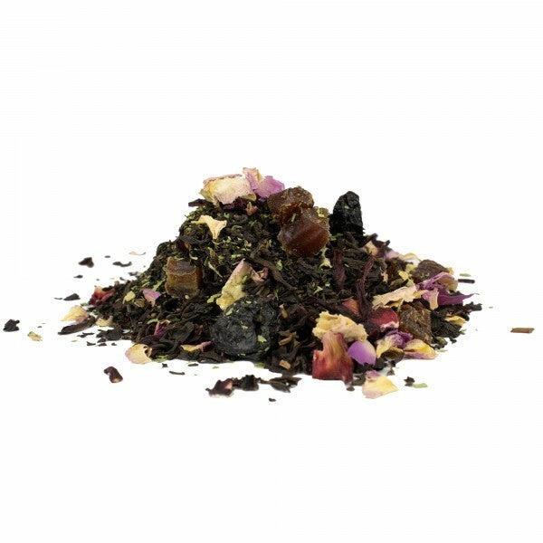 Ingrediënten: Zwarte theemelange* (China), dadelstukjes* (dadel*, rijstmeel*), zwarte thee Assam* (India), natuurlijk zure kersensmaak, hibiscusbloemen*, natuurlijke bourbon-vanillesmaak, steviablaadjes*, zure kersen* (1%), rozenblaadjes*, stukjes vanille* (0,1%).