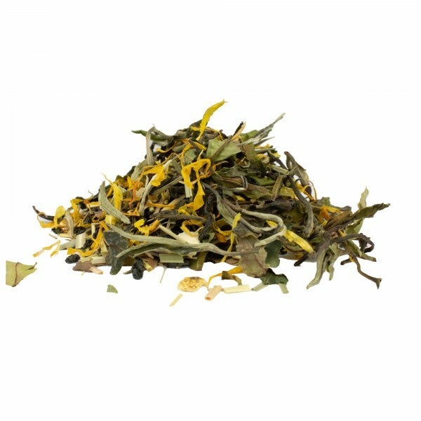 Ingrediënten: Witte thee Mao Feng* (China), sinaasappelschil* (23,2%) witte thee Pai Mu Tan* (China), citroengras*, sinaasappelolie*, goudsbloemen*.