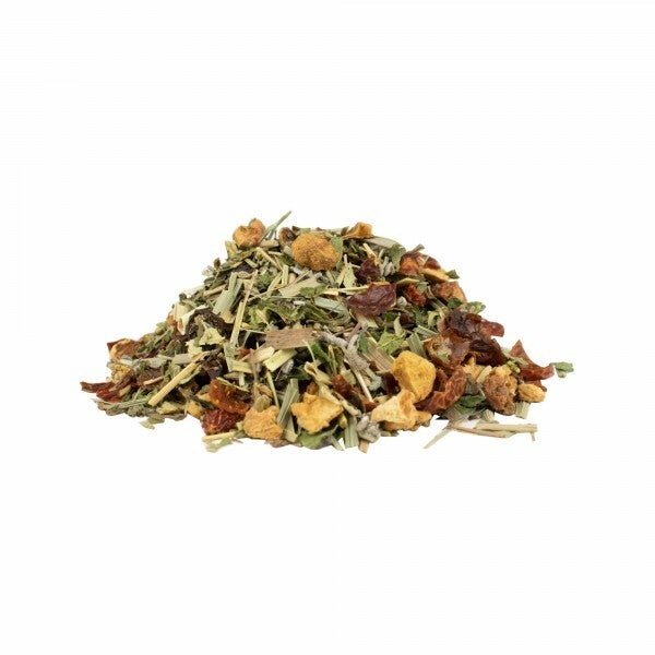 Ingrediënten: rozenbottelschil*, appelstukjes*, citroengras*, hibiscusbloemen*, steranijs*, groenemuntblaadjes*, salieblaadjes*, brandnetelbladeren*, rozemarijnblaadjes*, pepermuntbladeren*, lindebloesem*, tijm*, rozemarijnolie*, muntolie.