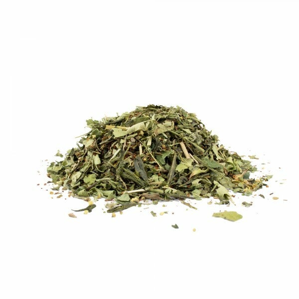 Ingrediënten: verbenabladeren, groene thee sencha (China), anijs, damesmantelkruid, brandnetelbladeren, rooibos (Zuid-Afrika), duizendbladkruid, groene muntbladeren, vlierbloesem, natuurlijk aroma