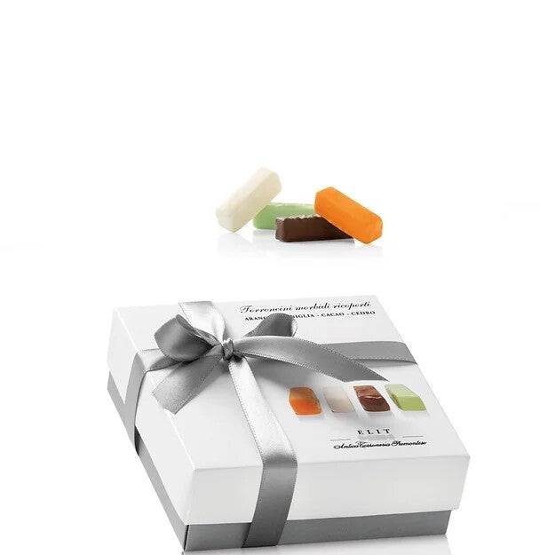 Kleine zachte nougatsnoepjes omhuld met 4 smaakjes, verpakt in mooi vierkant doosje, voorzien van striksluiting en met afbeelding van de snoepjes met de smaken: