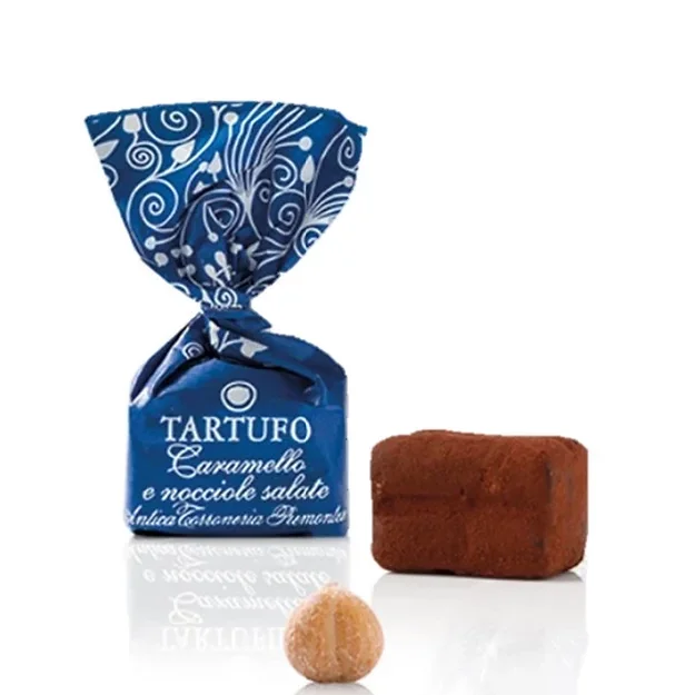 Chocoladetruffels met karamel en gezouten IGP hazelnoten uit Piemonte, bedekt met een laagje cacaopoeder.