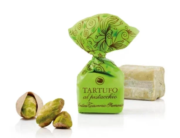 Chocoladetruffels met stukjes Italiaanse pistachenoten, verpakt in vrolijk groen papier.